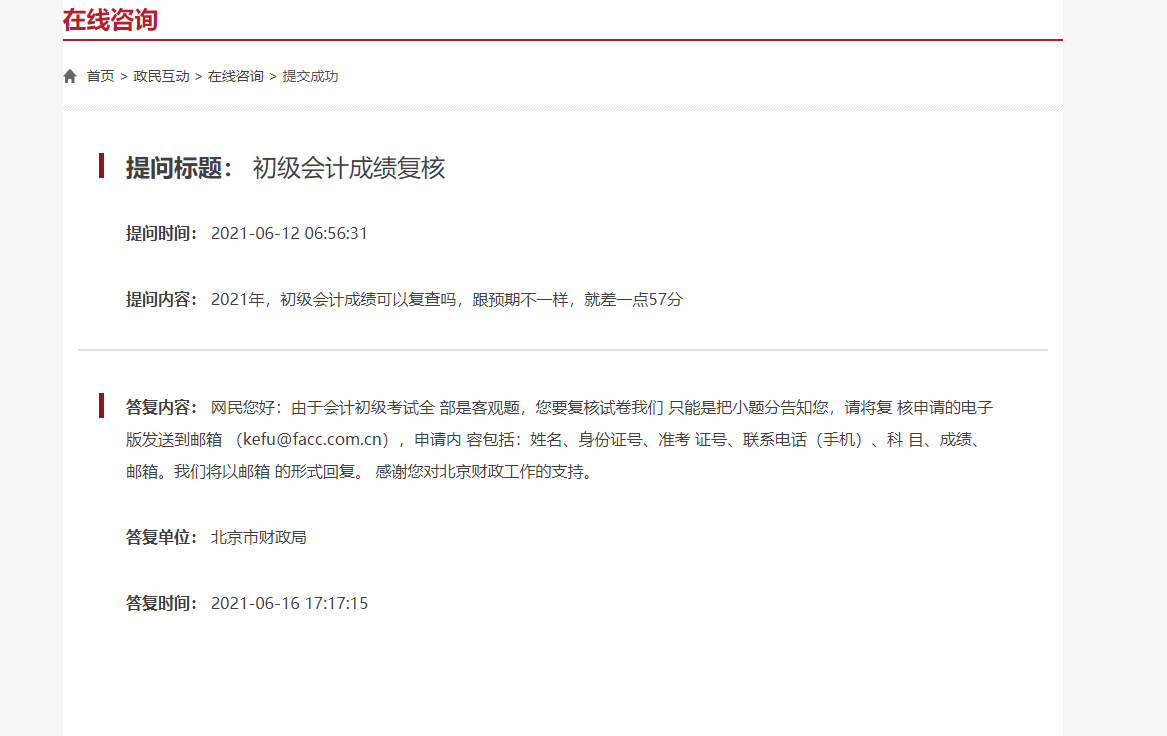 近日网友在线向北京财政局提出2021年初级会计师考试成绩复核请求,得到答复是可以通过电子邮箱申请。以下是具体问答具体内容: