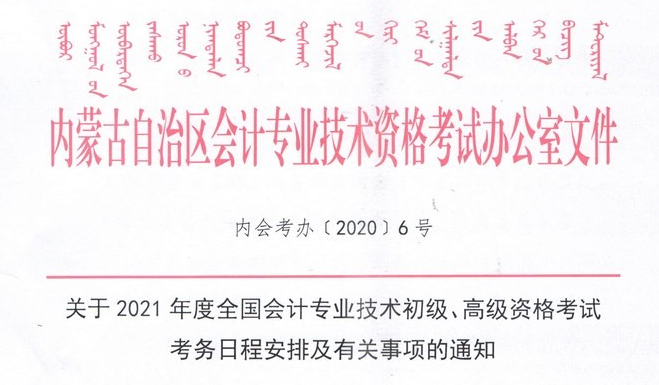 根据财政部、人力资源和社会保障部、全国会计专业技术资格考试领导小组办公室《关于2021年度全国会计专业技术初级、高级资格考试考务日程安排及有关事项的通知》(会考(2020)8号)精神,2021年度全国会计专业技术初级、高级资格考试定于2021年5月举行,全部采用无纸化方式。为了确保会计专业技术资格考试工作顺利进行,经研究决定,现将内蒙古自治区初级、高级会计专业技术资格考试考务日程安排有关事项通知如下: