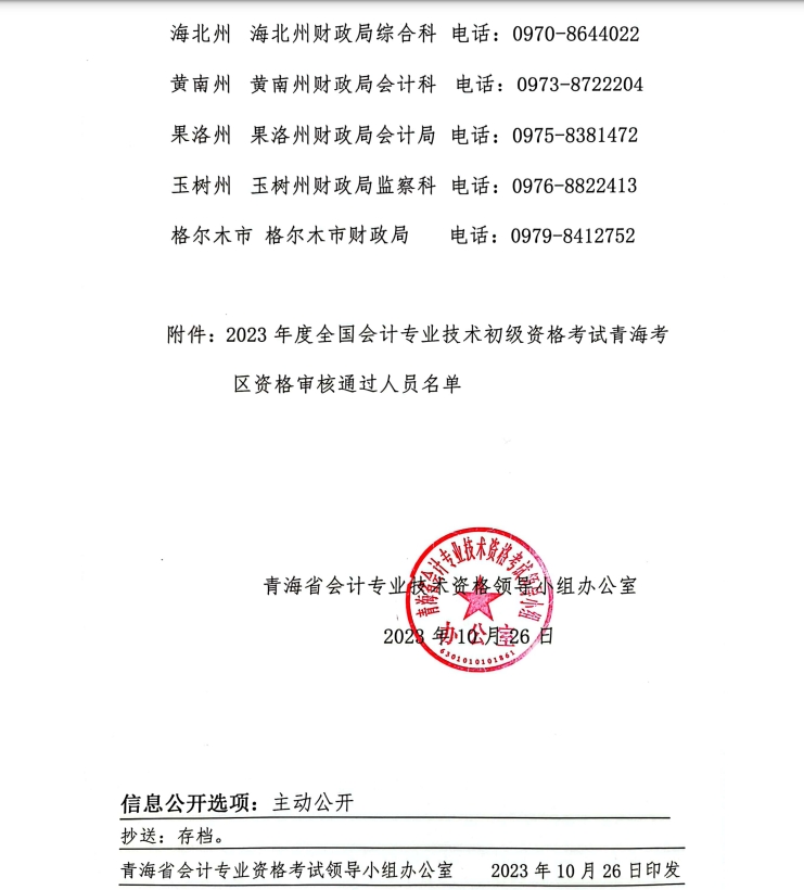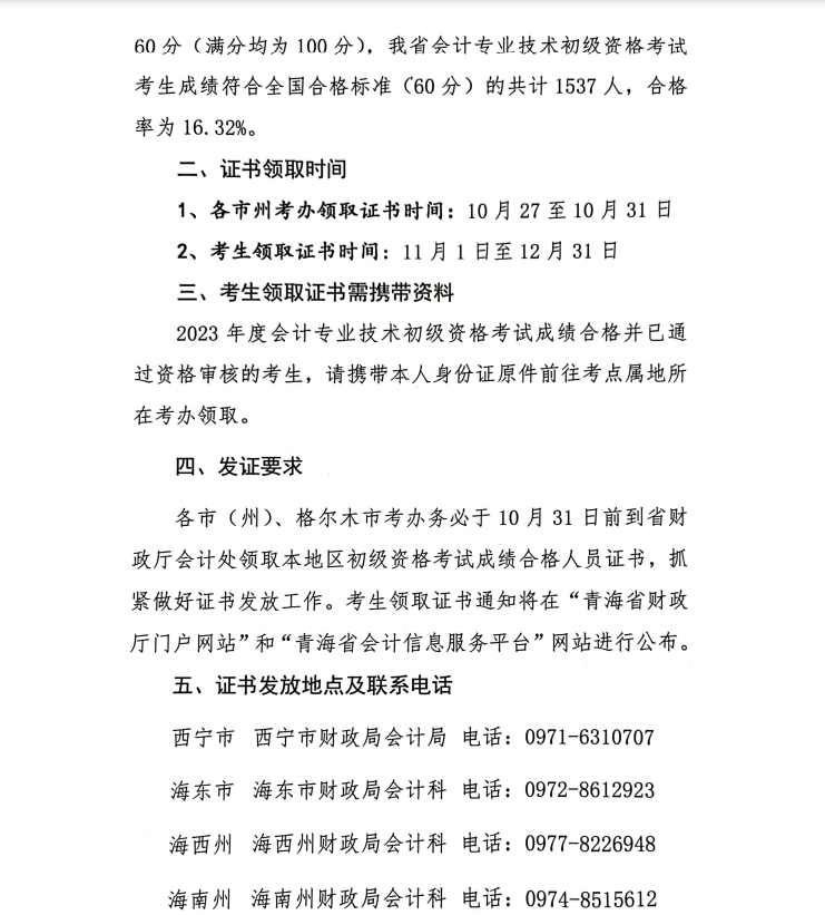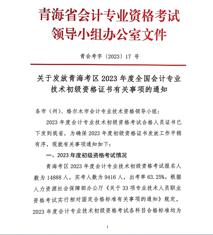 关于发放青海考区2023年度全国会计专业技术初级资格证书有关事项的通知.pdf