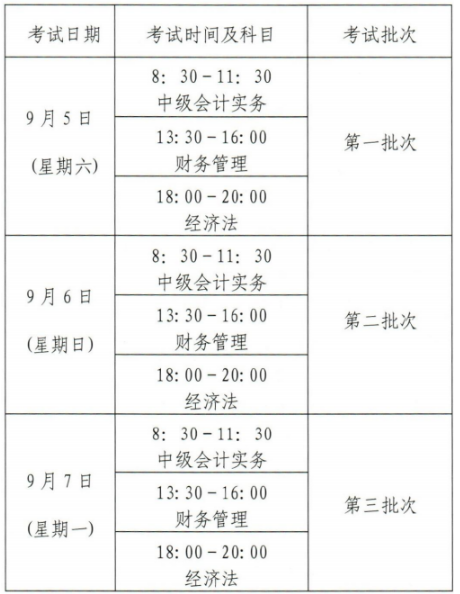 (一)中级资格:2020年度中级资格考试于9月5日一7日举行,共3个批次,各科目具体考试时间及批次如下: