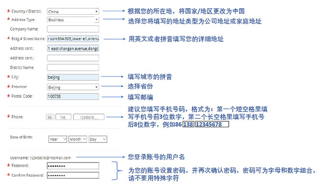第五步、地址信息填写,用拼音就可以。Phone这一项填写,建议您填写手机号码,格式为:第一个短空格里填写手机号前3位数字,第二个长空格里填写手机号后8位数字,设置密码,最好先想好,然后将登录账号密码一并记录下来,以免忘记,修改比较麻烦。
