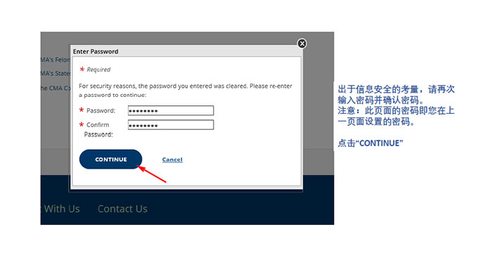 第七步、出于信息安全的考量,请再次输入密码并确认密码。注意:此页面的密码即您在上一页面设置的密码。点击“CONTINUE”