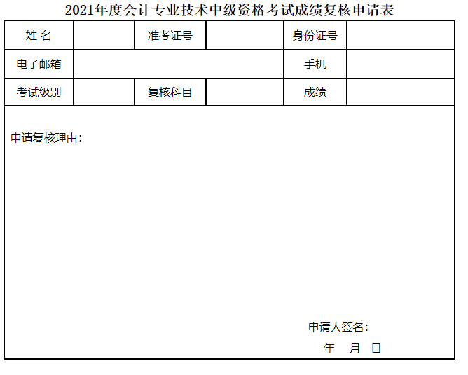 2021年度全国会计专业技术中级资格考试成绩已经公布,对成绩有疑义需申请复核的考生,请于2021年10月29日前提交复核申请至指定邮箱(93509721@qq.com),市考办组织进行成绩复核,复核结果于2021年11月5日前反馈至申请人邮箱。