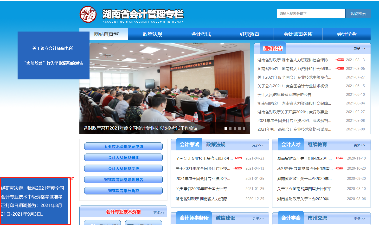 今日从湖南省财政厅会计管理专栏了解到湖南省财政厅对2021年中级会计考试准考证打印时间做了调整,调整后的中级会计准考证打印时间为8月21日-9月3日。