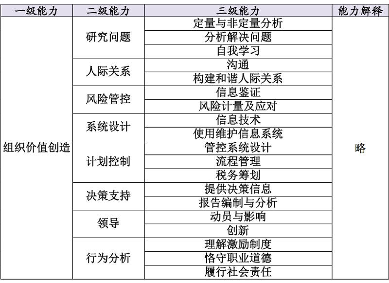 基本能力,包括沟通能力、量化能力、分析思考与解决问题能力、人际关系处理能力、信息技术能力;会计能力,包括对外报告及分析、计划分析与控制、税法与税收筹划、信息系统、鉴证与内部控制,职业价值观、道德与职业态度;管理能力,包括,领导力,道德与社会责任、过程管理与优化、政策风险及合规、其他核心商业技能。