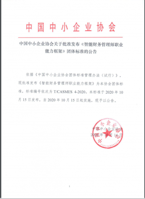 今年10月,中国中小企业协会在2020中国中小企业发展大会上正式公布《智能财务管理师职业能力框架》团体标准,并启动“智能财务管理师专业能力项目”。
