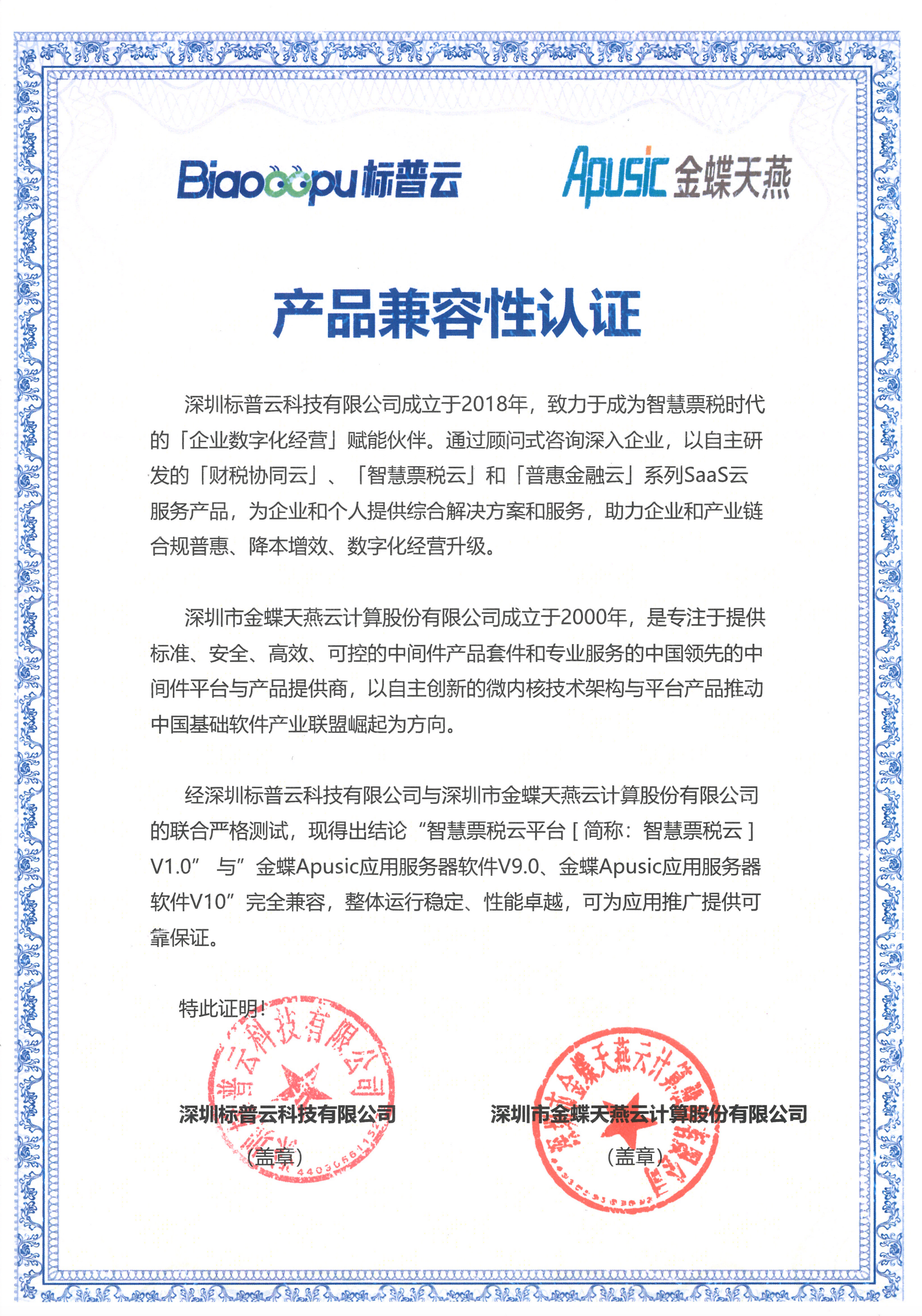 近日,标普云与深圳市金蝶天燕云计算股份有限公司(以下简称“金蝶天燕”)完成产品兼容性认证。经双方联合严格测试,证实标普云自主研发的“智慧票税云平台 [ 简称:智慧票税云 ] V1.0”与“金蝶Apusic应用服务器软件V9.0、 金蝶Apusic应用服务器软件V10”完全兼容,整体运行稳定、性能卓越,可为应用推广提供可靠保证。