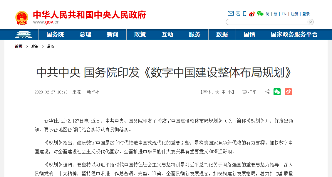27日,中共中央、国务院印发了《数字中国建设整体布局规划》(以下简称《规划》)。《规划》指出,建设数字中国是数字时代推进中国式现代化的重要引擎,是构筑国家竞争新优势的有力支撑。到2025年,基本形成横向打通、纵向贯通、协调有力的一体化推进格局,数字中国建设取得重要进展。