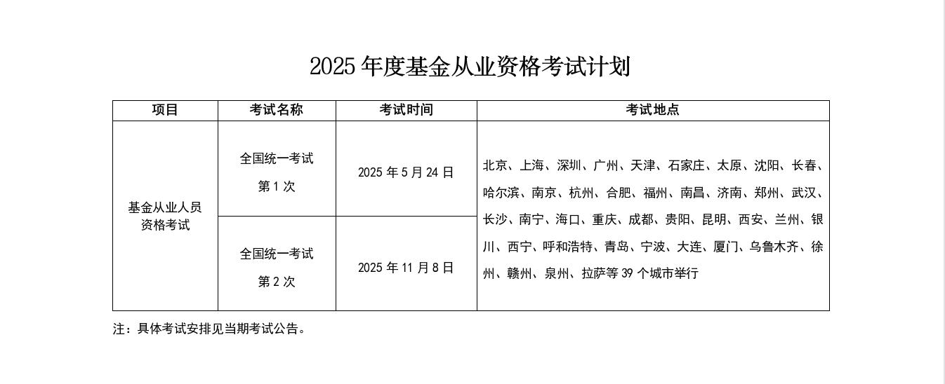 中国证券投资基金业协会现将2025年度考试计划公告如下: