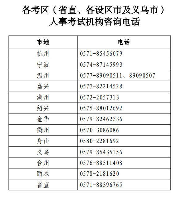 各考区(省直、各设区市及义乌市) 人事考试机构咨询电话