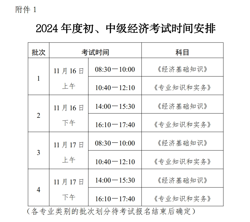 附件:1.2024 年度初、中级经济考试批次设置及考试时间安排