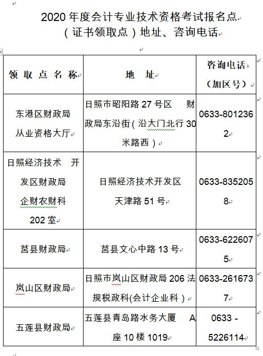 2020年度会计专业技术资格考试报名点(证书领取点)地址、咨询电话