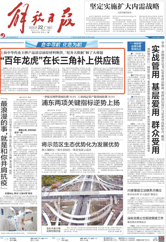 上海中华药业有限公司是著名的百年制药企业,王牌产品之一就是老百姓熟悉的乙类中成药“龙虎牌清凉油”。3月、4月本应是企业生产旺季,却因疫情影响,需要从印度进口的原材料药用级薄荷脑暂停供应,仅有少量库存。原料难以支撑大批量生产,是中华药业复工过程中遇到的最大难题。