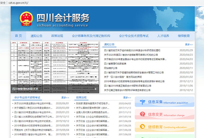 四川会计服务网隶属于四川省财政局,此站提供四川省内会计管理相关业务,包括会计信息采集、会计继续教育、会计跨省调转等业务;发布会计考试相关政策,包括初级会计考试、中级会计师考试、高级会计师考试等会计考试信息;发布最新省内会计管理相关政策法规等信息。
