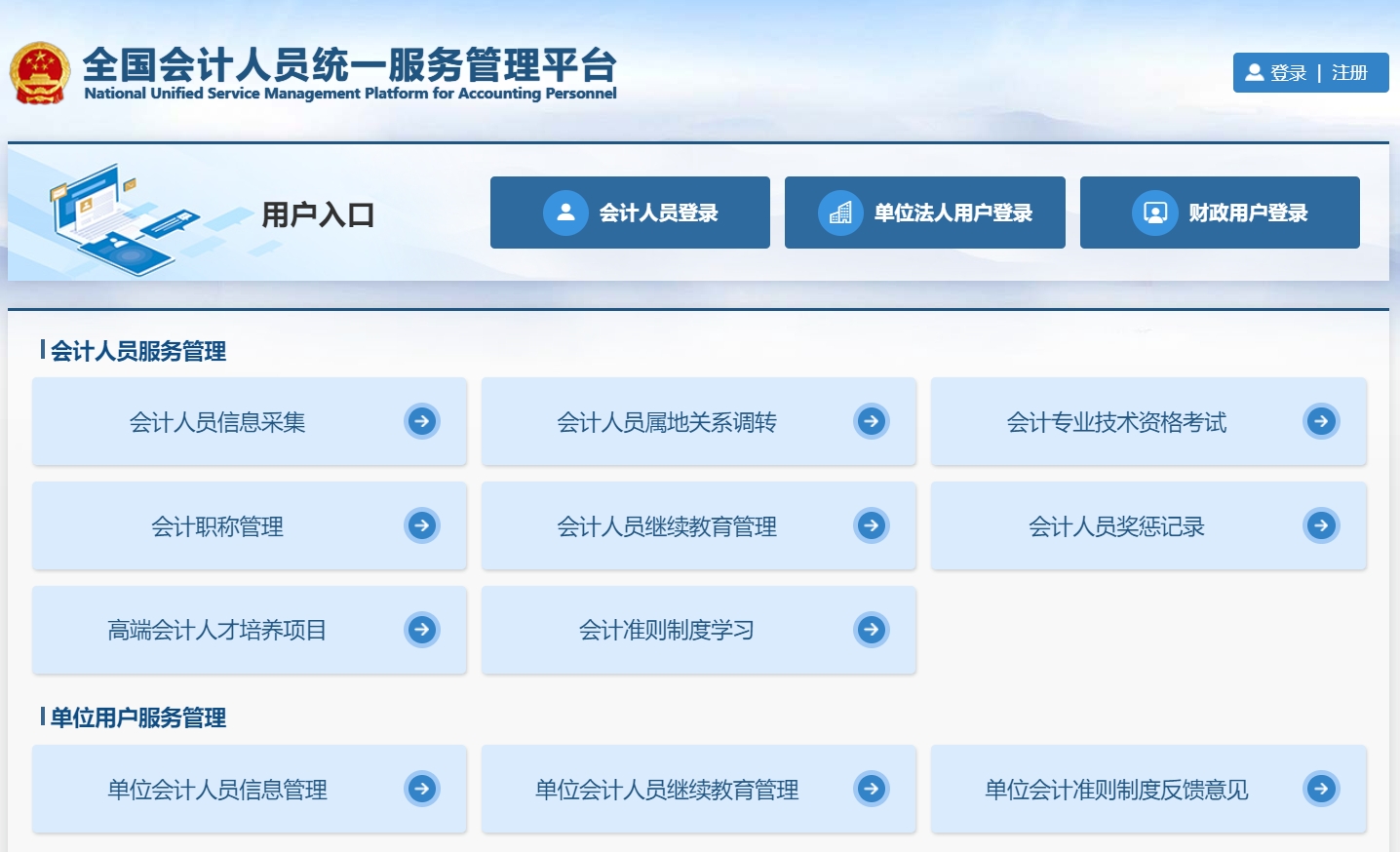 自8月15日开始全国会计人员须登录全国会计人员统一服务管理平台(网址: https://ausm.mof.gov.cn/index/)办理会计人员信息采集、信息修改、信息跨省调转业务。原天津市会计诚信平台将不再办理上述业务。会计人员首次登录全国统一平台须先完成注册才能办理业务(2024年会计中级资格考试的报考人员可直接登录)。