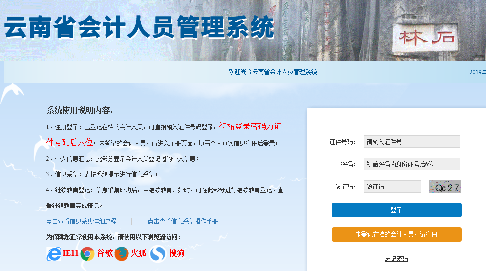 1、注册登录:已登记在档的会计人员,可直接输入证件号码登录,初始登录密码为证件号码后六位;未登记的会计人员,请进入注册页面,填写个人真实信息注册后登录;