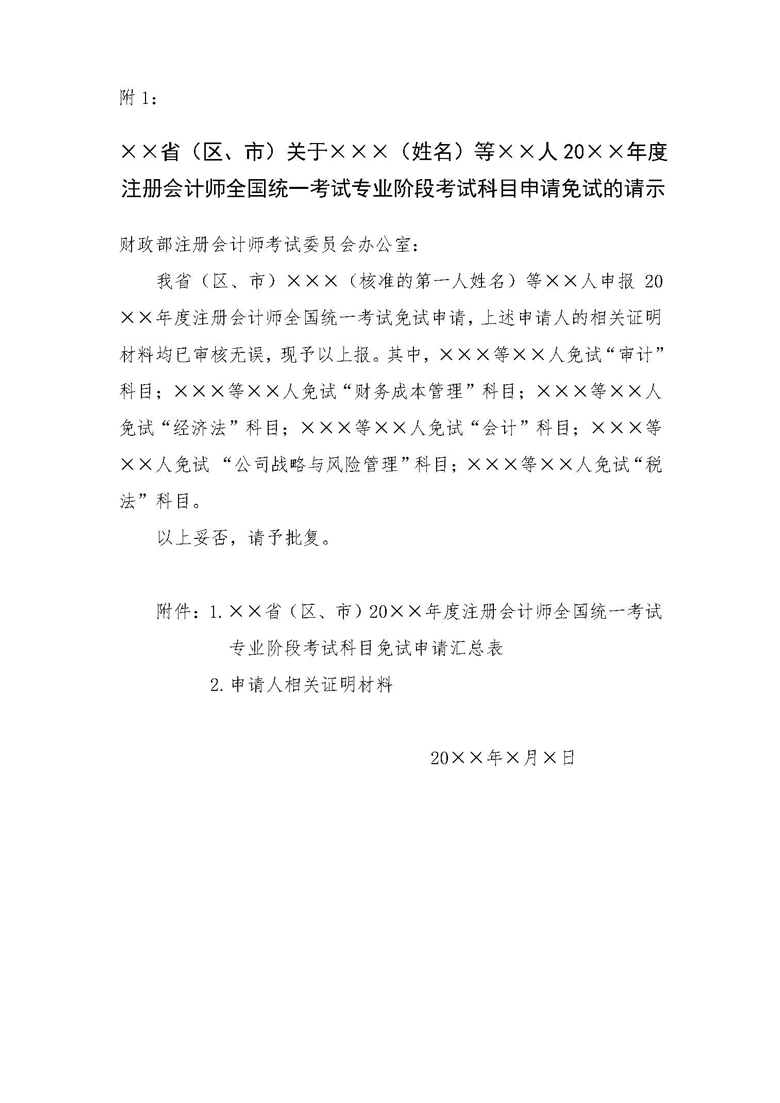 1.××省关于注册会计师全国统一考试专业阶段考试科目申请免试的请示(式样)