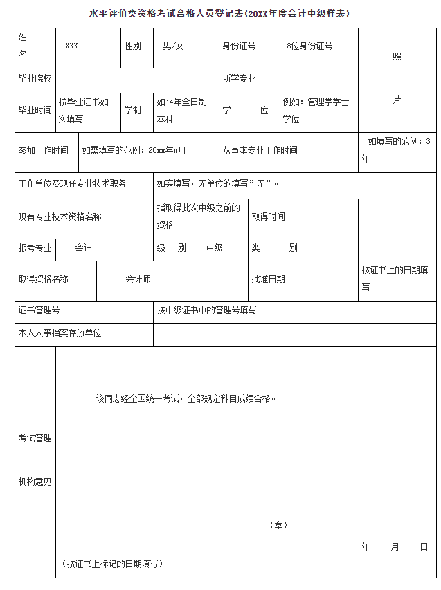 《水平评价类资格考试合格人员登记表》中级填表说明