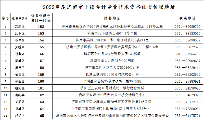 如有考生忘记自己当时报名所选择的审核区县,请登陆“财政部会计资格评价中心官网”→考试合格信息查询→查看自己的证书管理号第十三位至第十五位的号段,按照下面表格各区的号段对照,就可查到自己报名时所选择的区县。