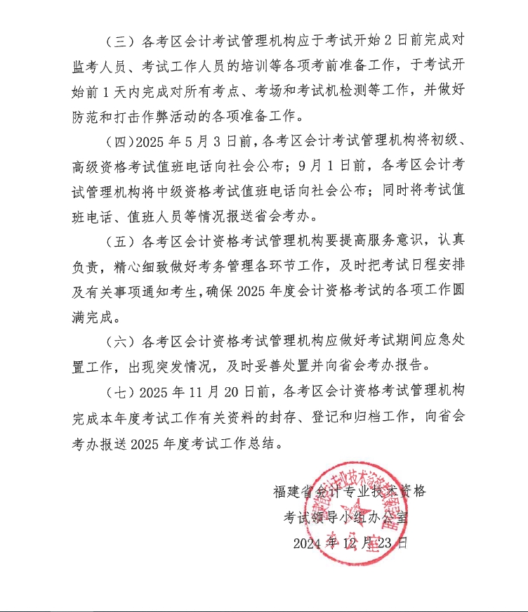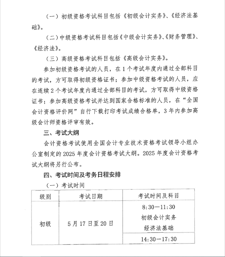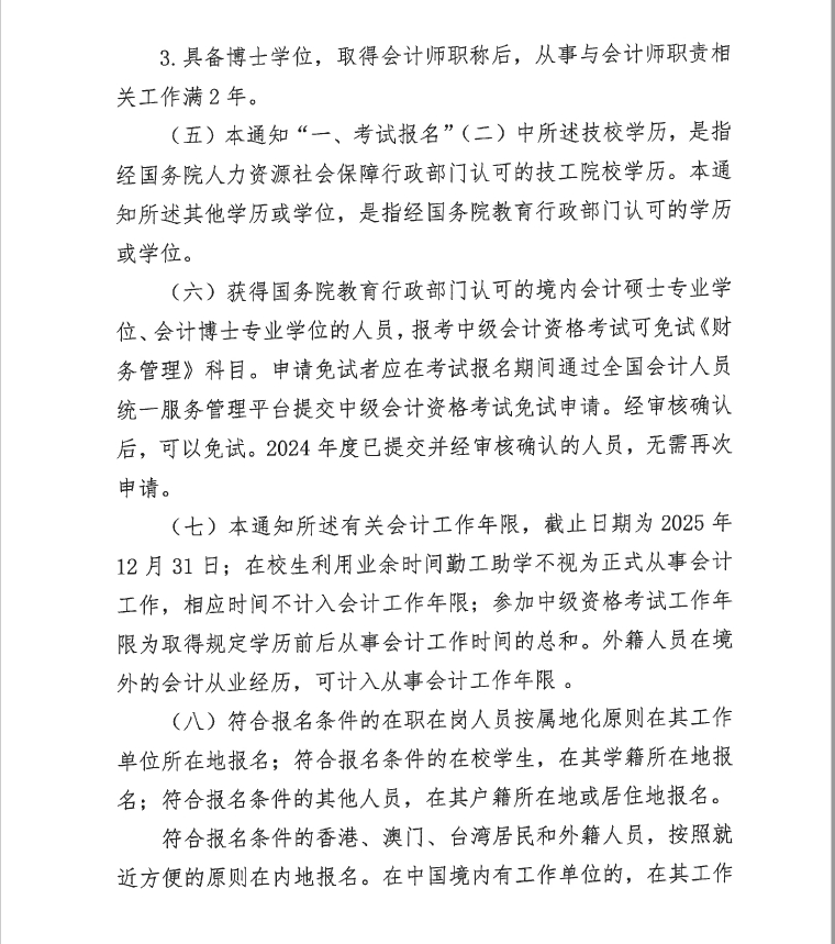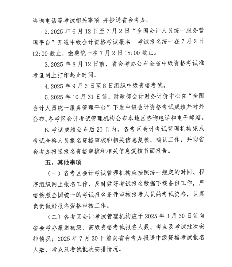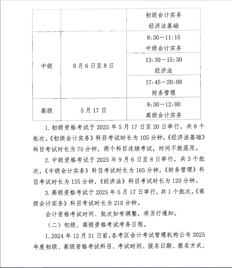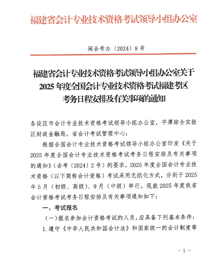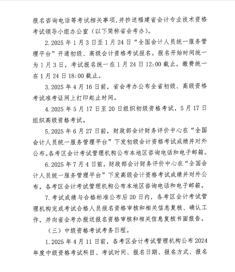 福建财政厅公布2025年中级会计职称报名时间和考试时间,报名时间从6月12日开始,报名截止到7月2日12点。报名资格审核方式:考后审核,另行通知。考试时间9月6日-8日。以下是报名通知的全文: