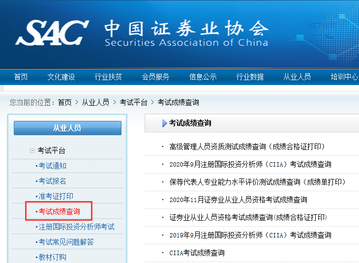 2、证券从业资格考试成绩查询查询途径:中国证券业协会网站-从业人员-考试平台-考试成绩查询-当次考试成绩查询。