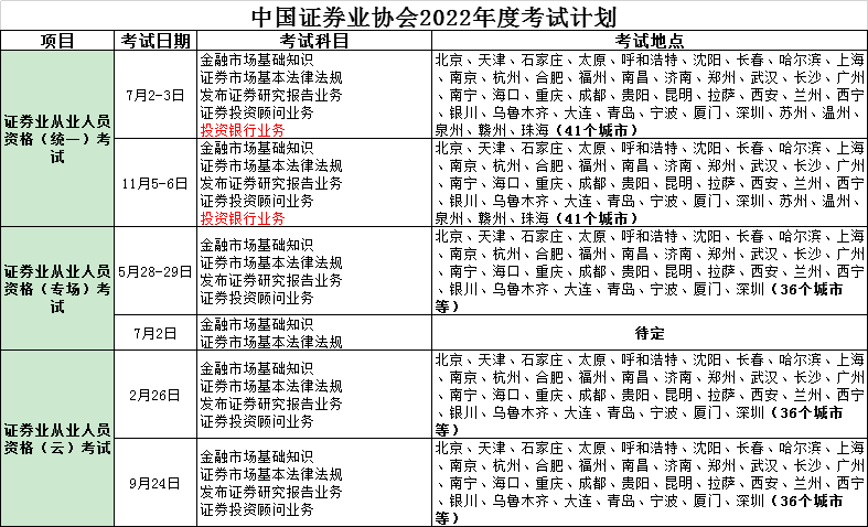 根据中国证券业协会2022年度考试计划公告得知:2022年证券业从业人员资格(统一)考试拟举办2次,证券业从业人员资格(专场)考试拟举办2次,证券业从业人员资格(云)考试拟举办2次,考试计划可根据实际情况进行调整,具体报名时间、考试时间以当期考试公告为准。安排如下: